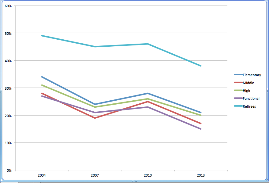 The drop from 2004 to 2013 in each teacher division is between 35% and 39%. The drop for retirees over that same time period is 22%, and among functionals 44%.