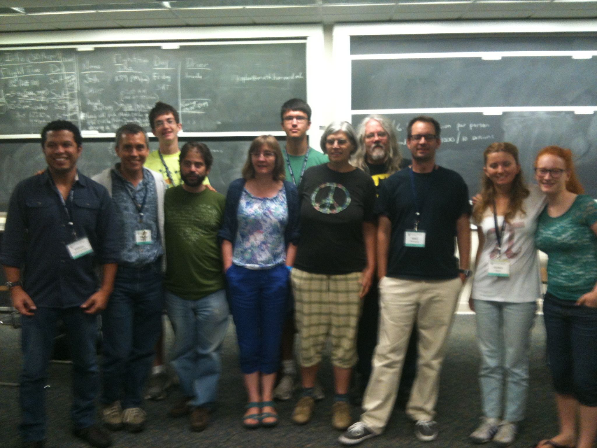 The summer institute drew teachers and non-teachers. The founders/leaders/patriarchs, Bob and Ellen Kaplan, couldn’t make it. A math circle/math community in South Bend organizes the event, and brings kids to play with the participants, and to participate in little circles. I knew in advance myself, my friend, Sue, and Owen. The rest were new to me.