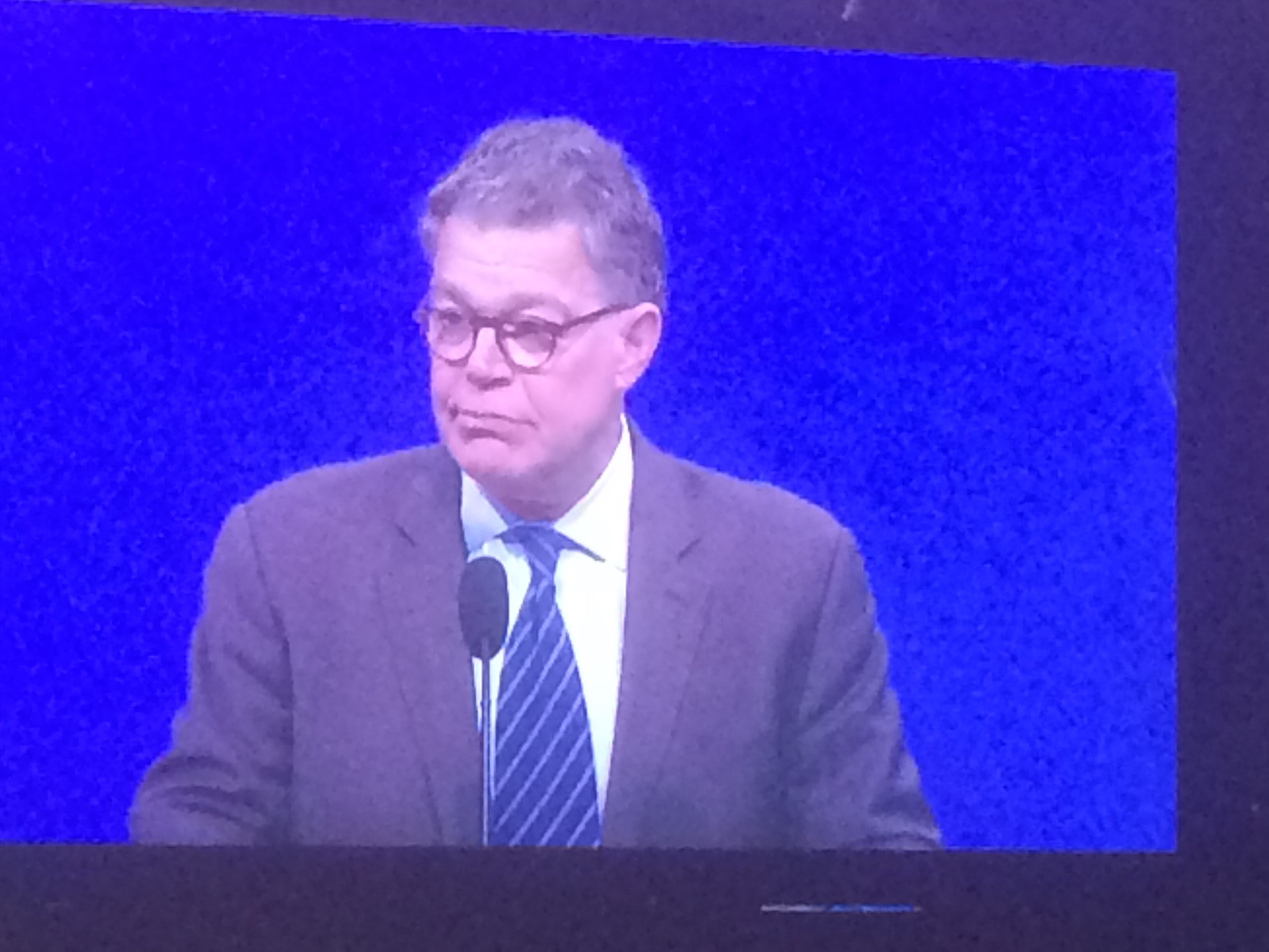 Klobuchar told stories about kids. Good speech stuff. She was funny – not as funny as Al Franken – but funny. Best line was about Wisconsin: “We love Wisconsin, because in Minnesota we can see Wisconsin from our porch.” Tell me she’s not interested in the VP slot! Delegates ate her up, applauded and cheered. But her second best response was when she thanked the Bernie Sanders supporters in the room – the cheering drowned her out, but leveled off when she thanked them for working for Hillary. And her biggest line was the wind up as she closed, asking for a commitment to work for Hillary.