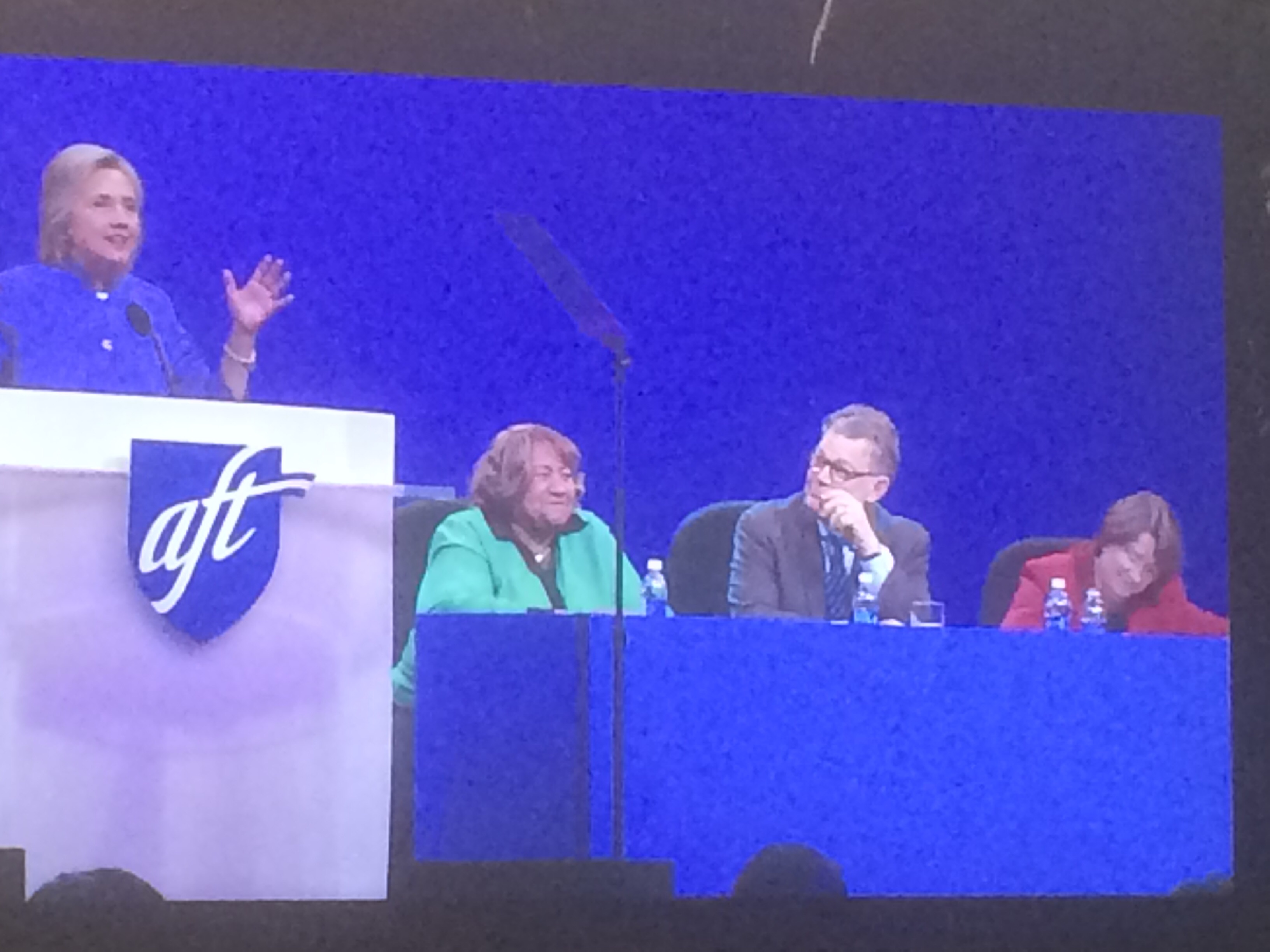 I met up with Lisa and Gladys from MORE in New York City, and began watching. Randi Weingarten was giving a meat and potatoes speech, nothing stood out, except her applause line for Hillary Clinton only got about half of the room standing, and not very loud. She asked for a warm welcome when Clinton arrived.