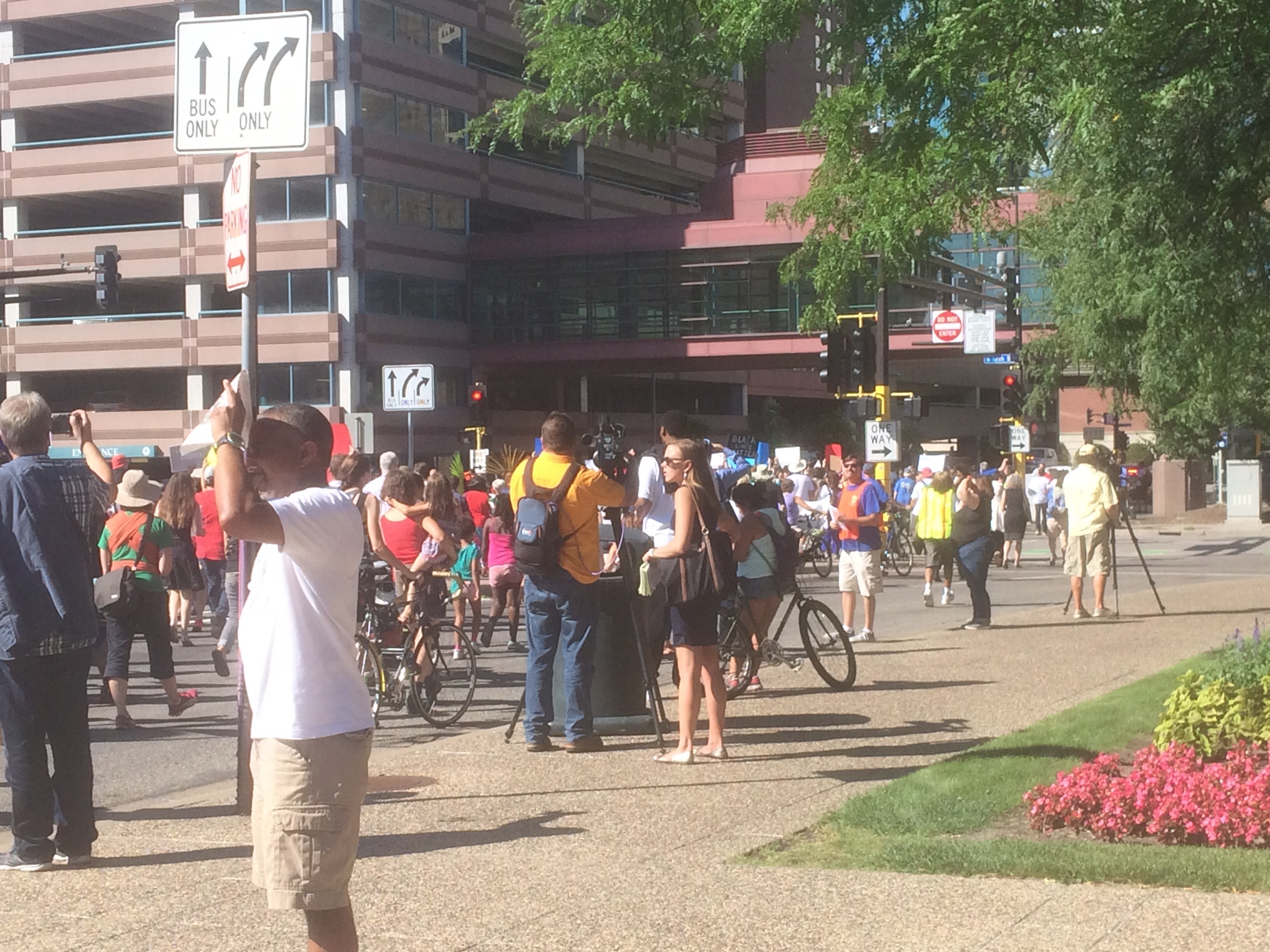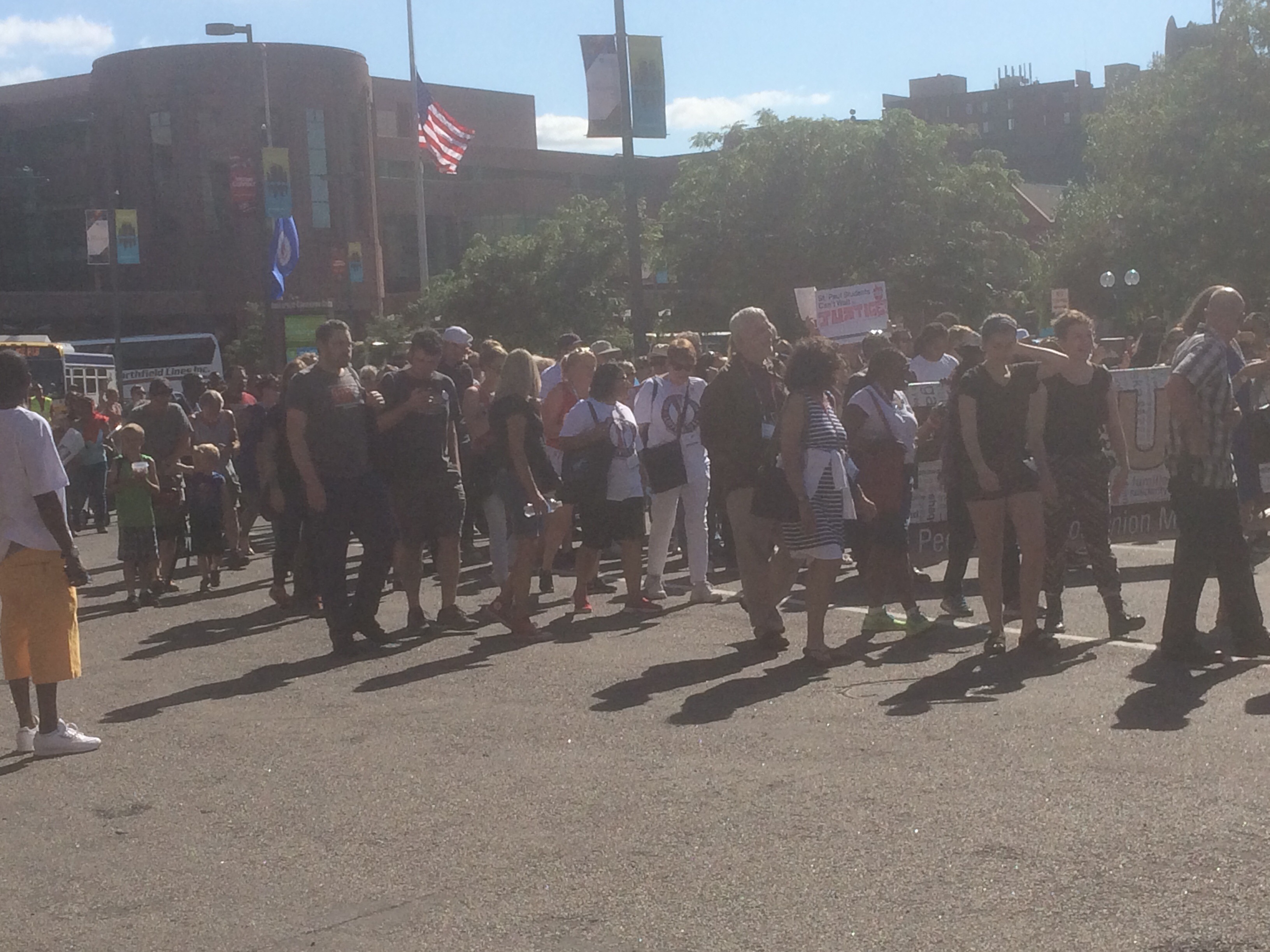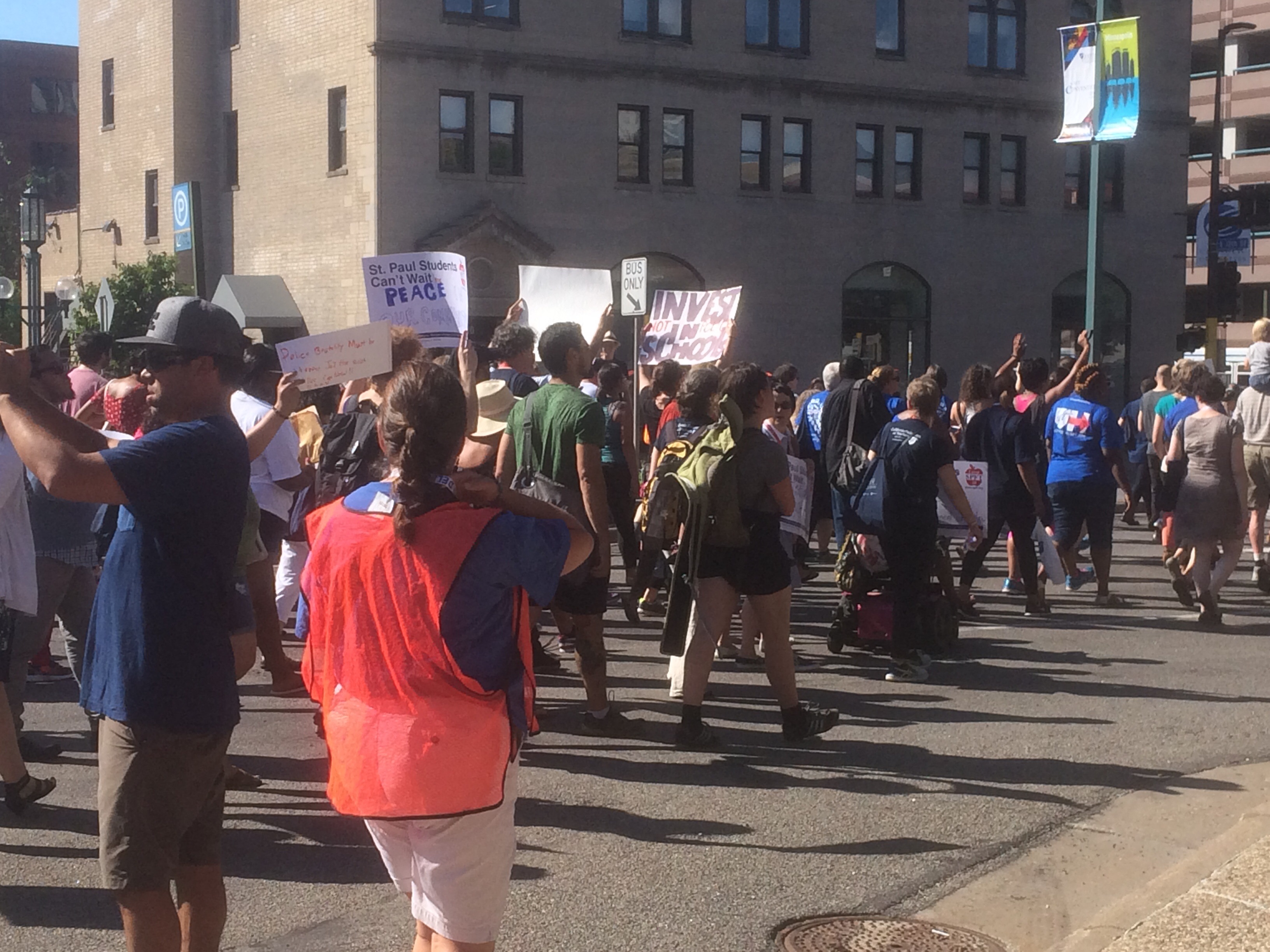 The hot part of Day 2 was not on the floor. The St. Paul Federation of Teachers and a neighborhood organization organized a march from the convention center to a downtown Minneapolis bank: