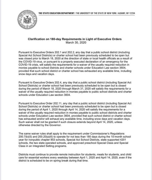 Andrew Cuomo signed an Executive Order on Friday, March 27. The order involved State funding for school districts, and the 180 day requirement – but the import was that public schools in NY State would have to stay open for remote learning from April 1 – April 15, even if they had scheduled breaks.