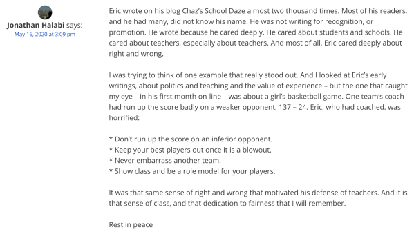 It’s been a month to the day since the world lost Eric Chasanoff to Covid, and a month to the day since the New York City teacher/blogger universe lost Chaz’s School Daze.