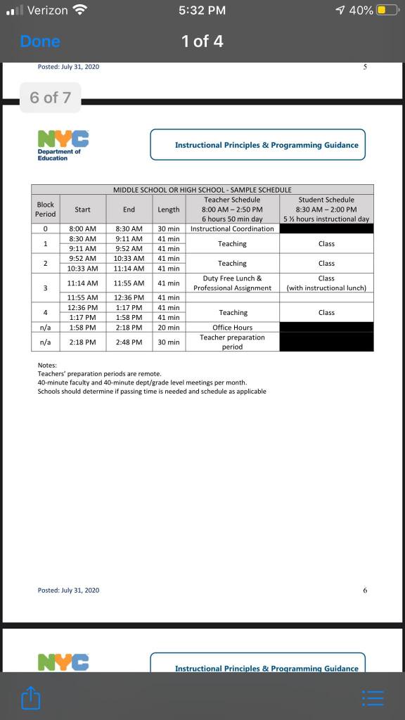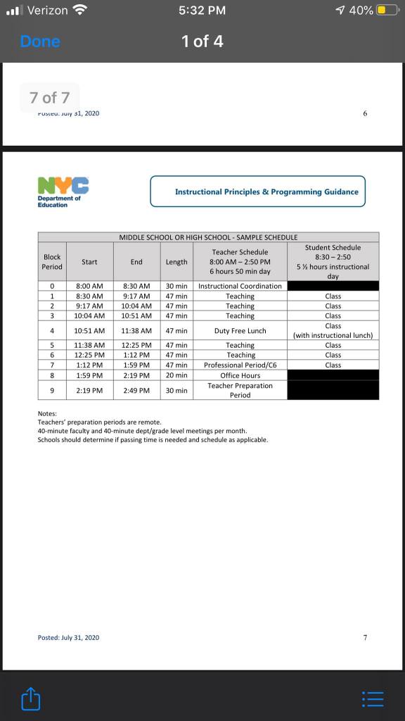 Thank you for your work and insight. I wonder if the DOE has any grasp on how much personnel they will have come September. My school makes every class (including AP) an ICT experience. Are they still expecting to follow IEPs? Who’s going to handle the remote learning kids while we’re in the classroom doing live instruction? What if a school doesn’t have enough remote learning teachers working from home? How many teachers are there in September after retirements, resignations, leaves, transfers, hiring freeze, etc. to handle small and remote classes? Who covers classes when teachers are absent? What’s the update on air filtration installation? Will all schools have nurses? When do custodians clean classrooms in these schedules?What kind of pedagogy are they expecting now that social distancing makes group work untenable? Do teachers even know what they’re going to teach? September is looking uglier with each passing day!