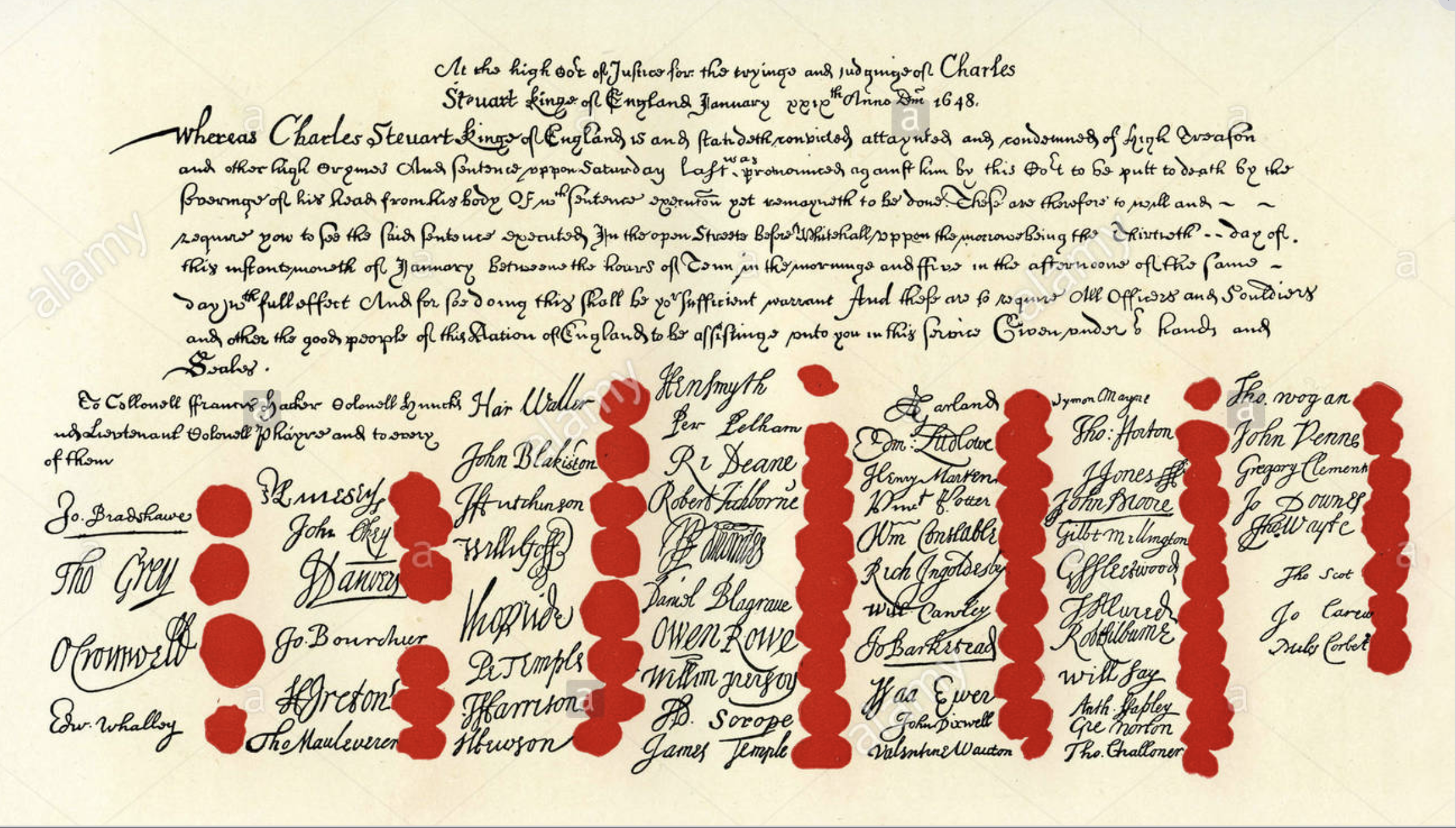 Charles I’s Death Warrant. Cromwell and Whalley signed at the bottom of the first column