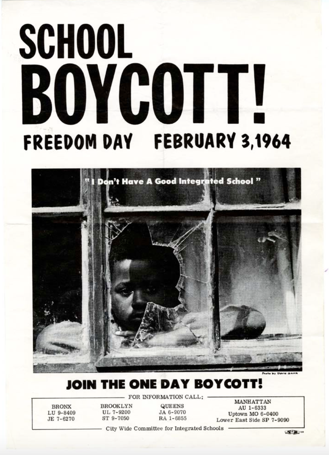 So here we are. 1964. March on Washington has just happened. Housing has been segregated by government policy. And schools in NYC, following housing patterns are segregated. Separate. And unequal. There are vocational and academic high schools in NYC. There are no academic high schools in Black neighborhoods. When there are cutbacks, they don’t hit academic high schools. Double sessions. The physical condition of Black schools is inferior. Not enough bathrooms in some. Repairs not made. Legally enforced segregation had been made illegal – but northern segregation was not written in law books, and was exempt.