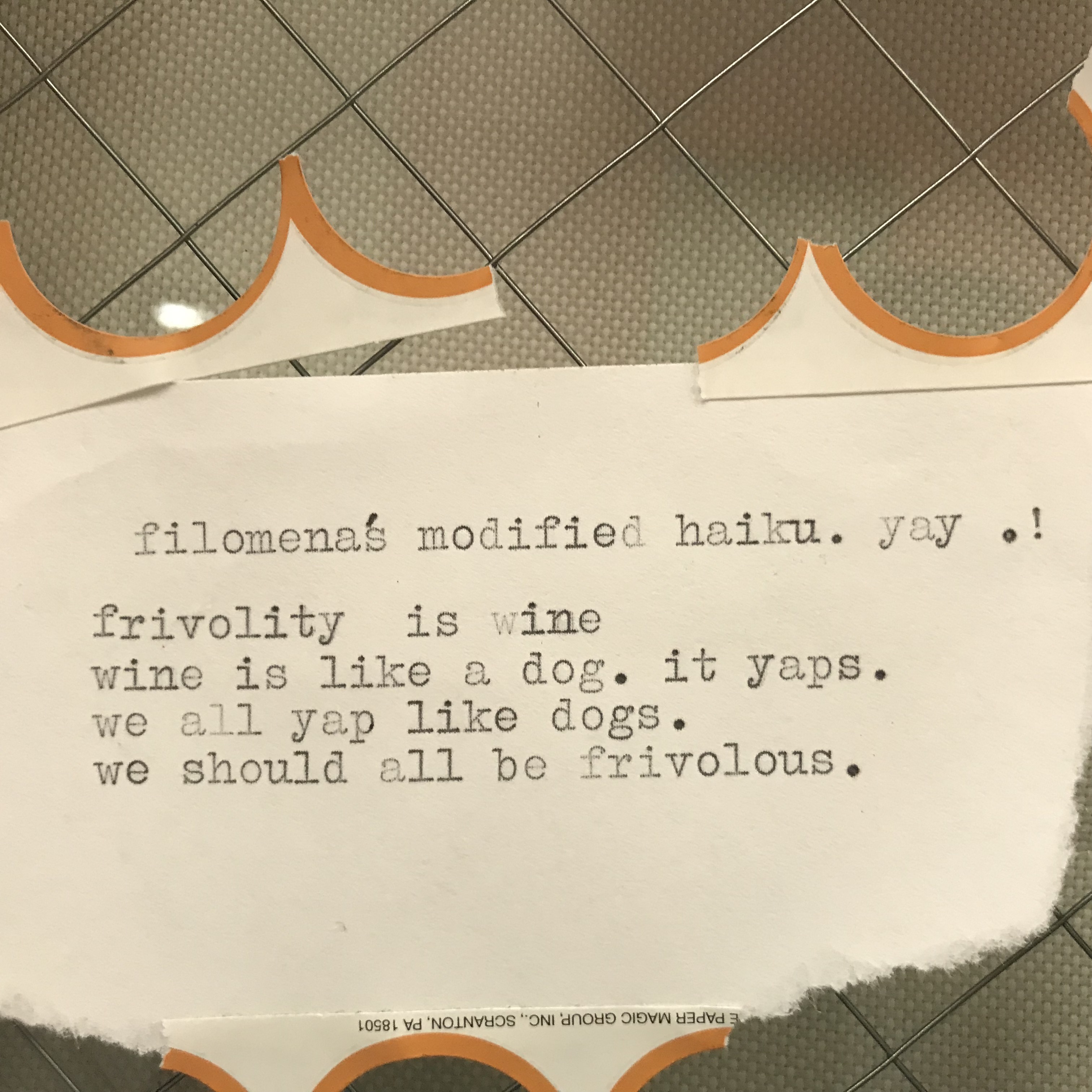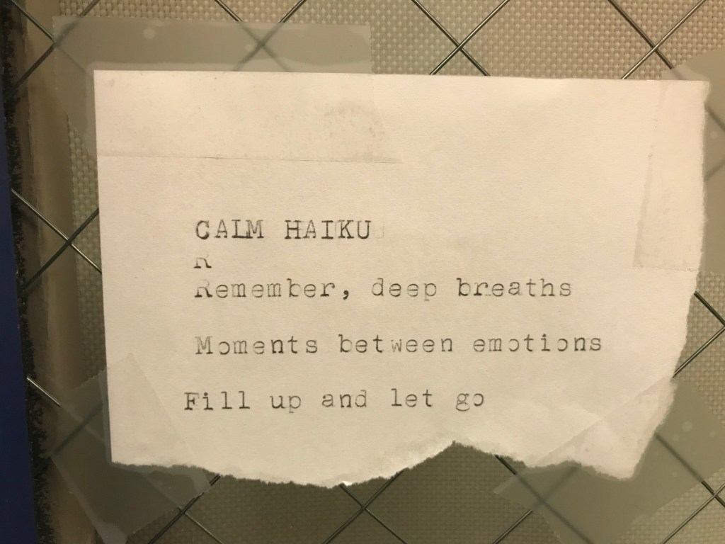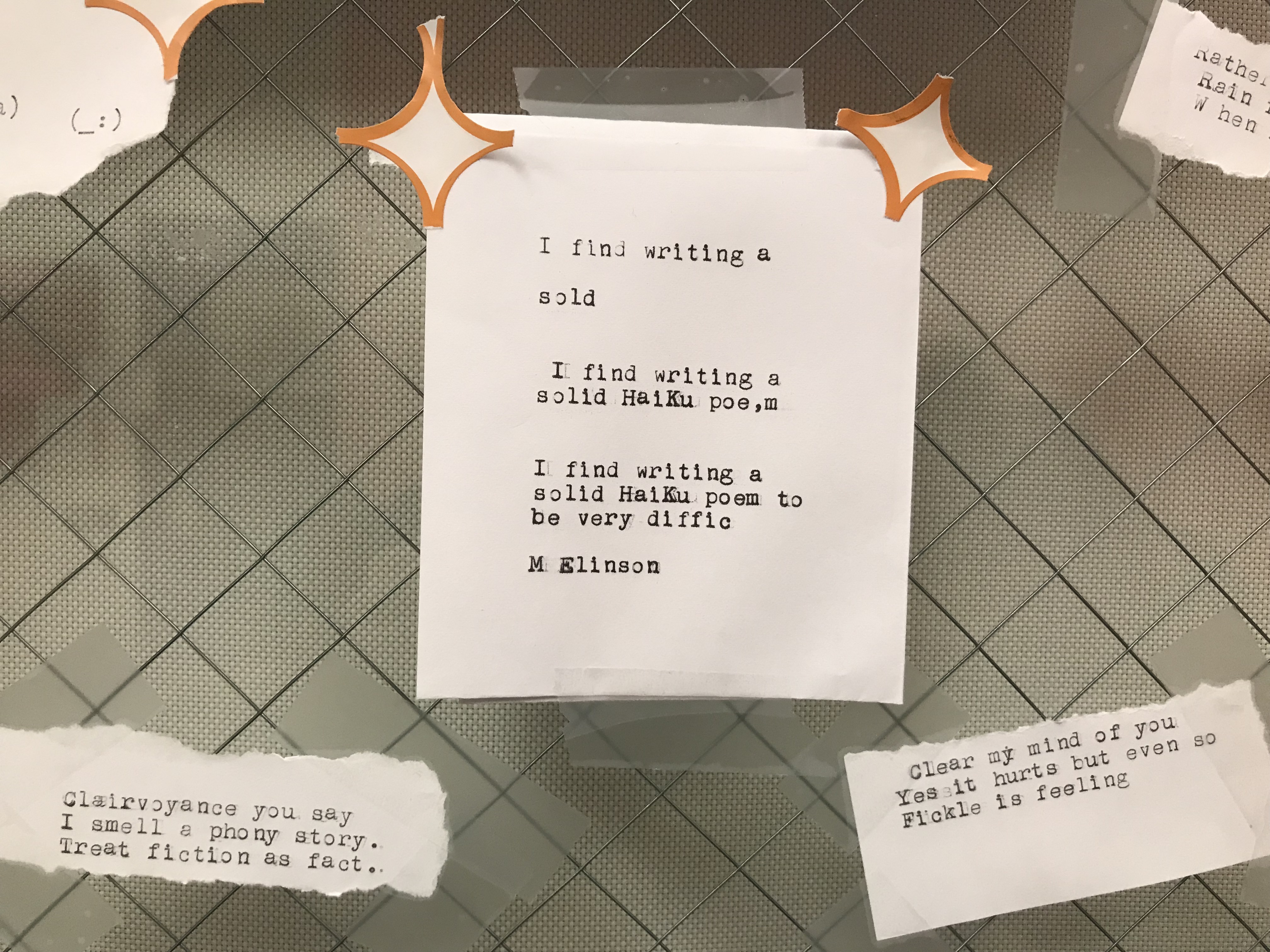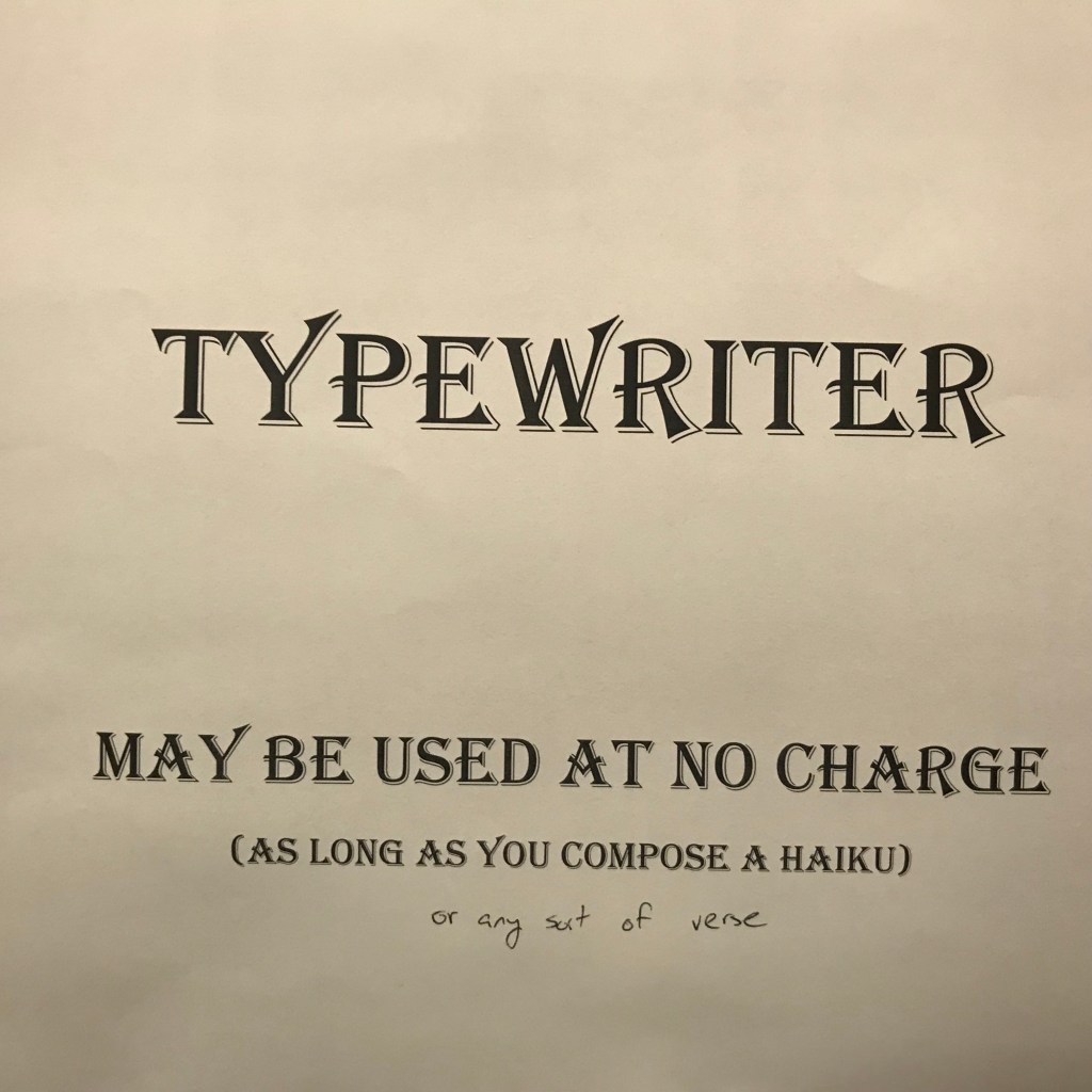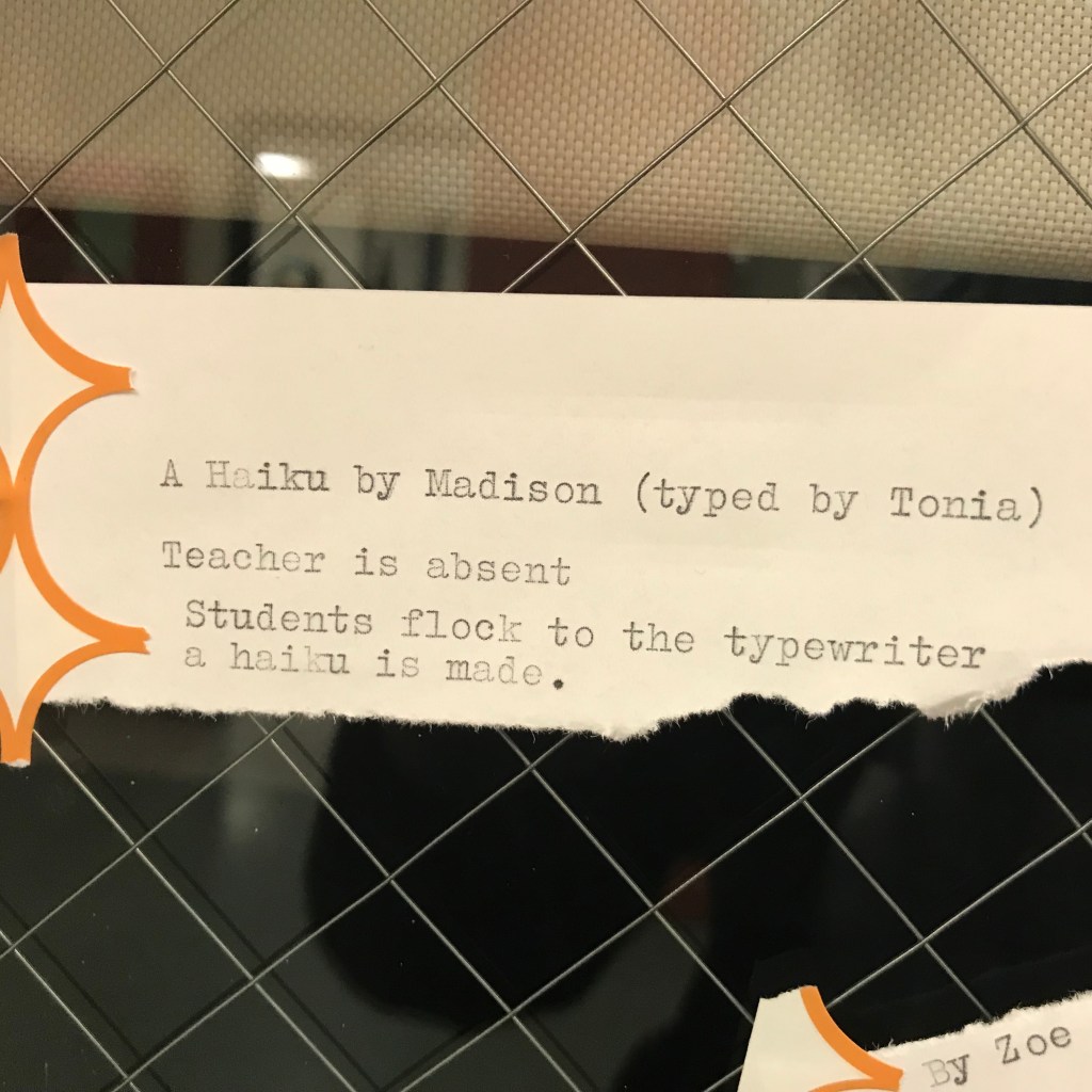 I put up a sign, announcing that there would be no charge if a student created a haiku or other verse. Of course there would be no charge in any case, but the sign had an instant effect, and I began to find haikus on pages left on the roller. Different kids were typing on the same sheet. The traffic got, not heavy, but consistent. I started posting some of their work on the office door.