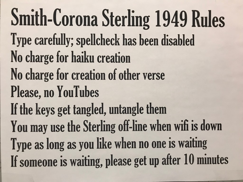 So here’s what I did. I went to a facebook typewriter collector’s and sellers group, told them my story, said no way was I leaving my gorgeous Erika in school, but did anyone have a more downmarket American typewriter. And I got a few responses, one was just across the GW, and I picked up a Smith Corona Sterling. The Sterling is simple, not elegant. But for the kids it is magical new percussive technology. I put up new rules: