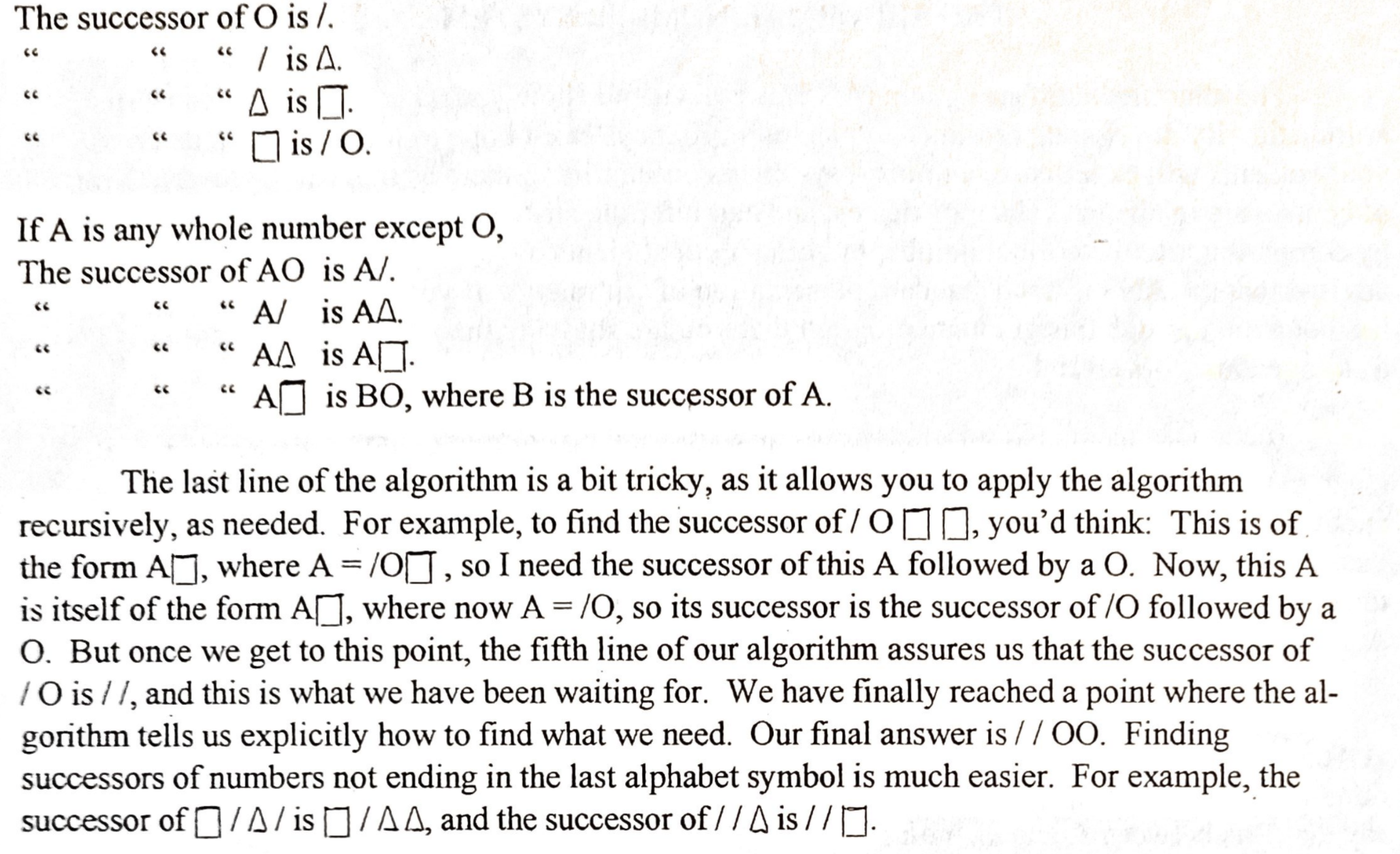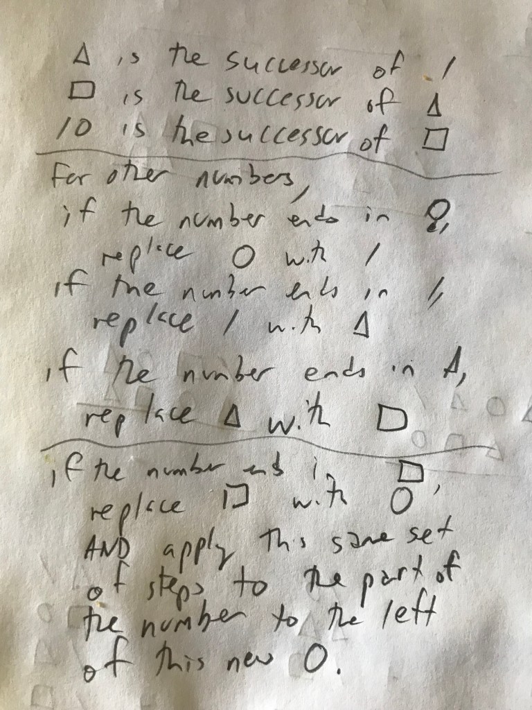 Where do we go next? Counting, predecessors, and addition (where I believe I diverge from my teacher). And we must talk about ❍ vs /. Stay tuned.