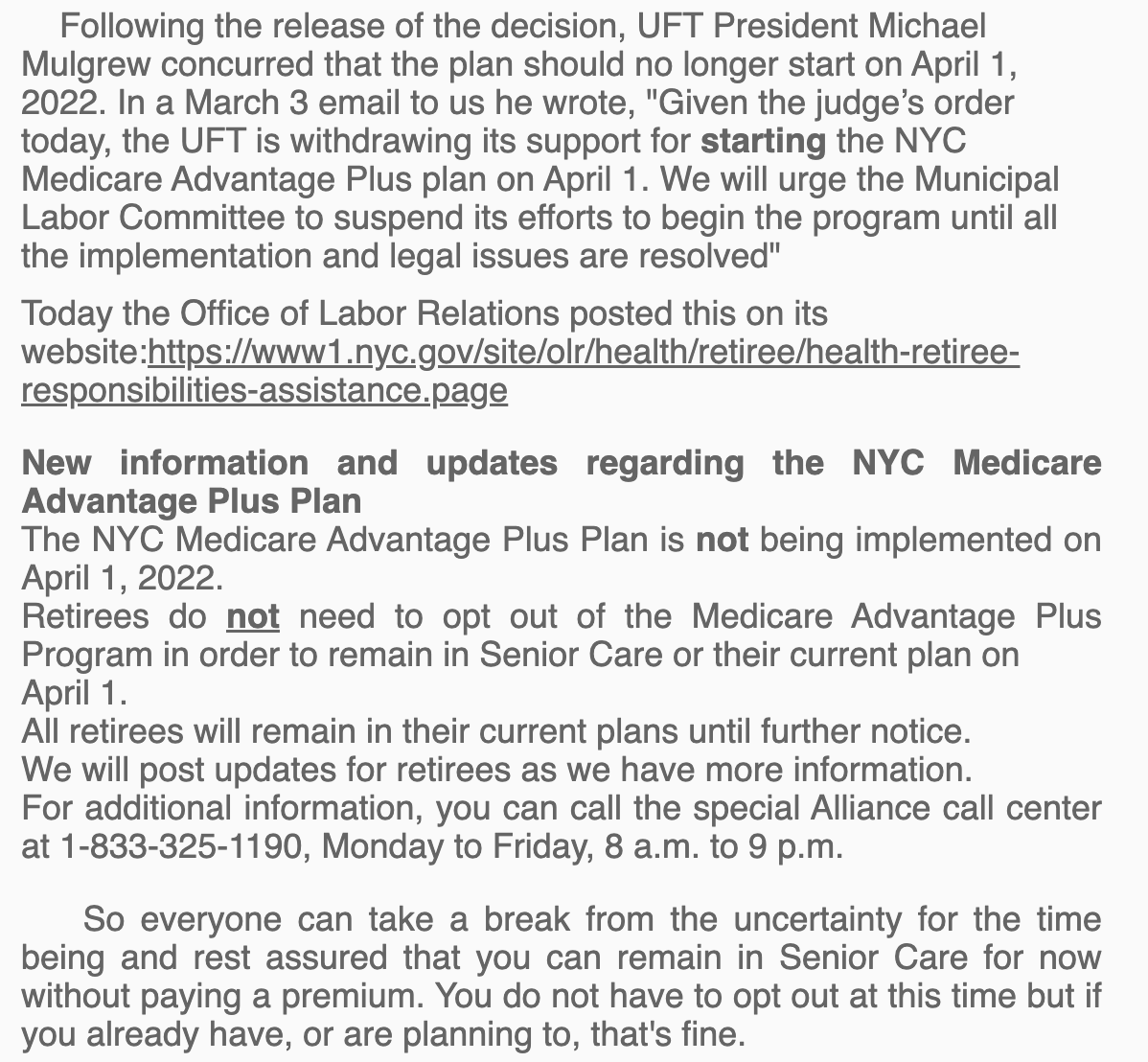 Almost three weeks ago a judge said the City and MLC and UFT could not penalize retirees with a penalty for not choosing their preferred plan: Medicare Advantage Plus. Mulgrew wanted to fine members who kept their traditional Medicare – judge said no. There’s huge holes in that decision. But now the City is appealing and Mulgrew says, for now, MAP is not going to start.