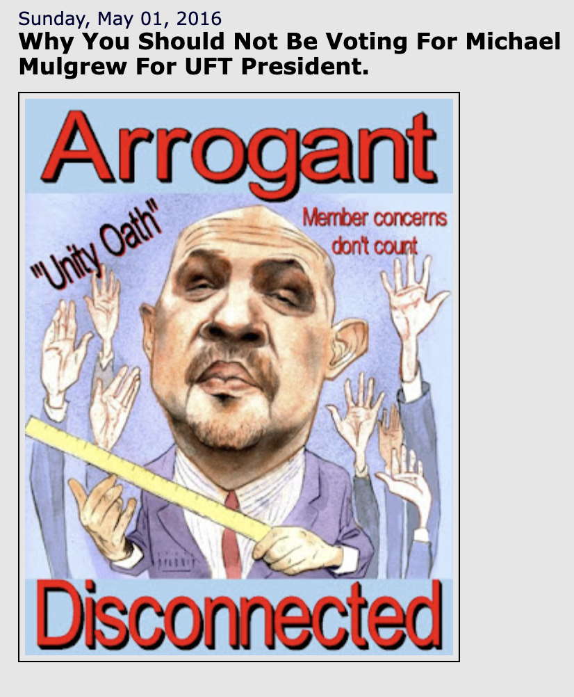 You should read it. I said, for the good of the union, they should remove him. Put in someone else. Almost anyone. This would be bad for me politically – United for Change has a chance (albeit small) against Mulgrew – but we really would not have much of a chance against anyone else. But people are so angry at him, some of that anger gets turned into anger at the UFT, which is bad for all of us. So, even though it would not help me, I suggested they remove him for the good of the union.