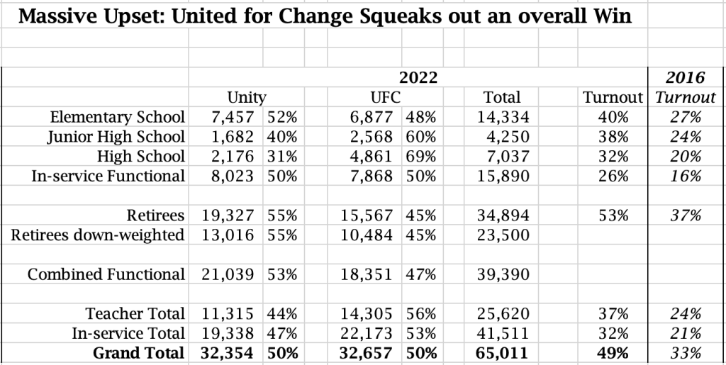 Definitely possible, but not very likely. United for Change has consistently received positive campaign feedback – but just not at the level of the teacher vote doubling or a full 10% of Unity switching sides. We will make gains, maybe big gains – but literally doubling the vote? Some signs are promising. Unity people are telling us that they switched. Even a couple of candidates told us they voted against themselves. We are surprised to encounter cluster of retirees who we thought were apolitical who have been actively spreading the word. And we have run into elementary school teachers who just want a change – in ways that we did not expect. But at this scale for this to happen? I don’t think so.