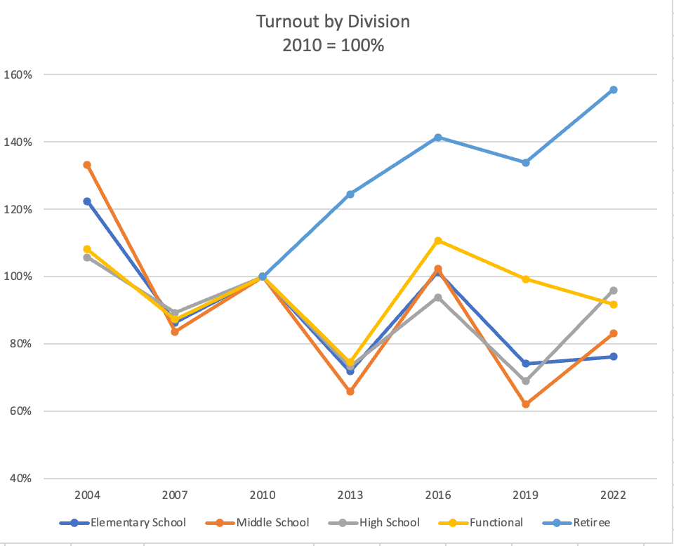 For now, the chart is just raw turnout by division, by year. I am missing two years of retiree data – what I had was just the cap number for those years.