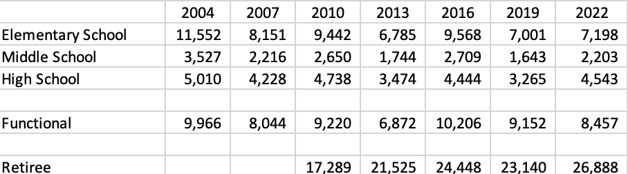 The graph treats 2010 as 100% for each division, and you can see patterns. 2022 (still missing numbers) seems to roughly return to 2016 levels, after a dip in 2019. Wonder what happened to elementary? And the retirees are their own story (Medicare Advantage).