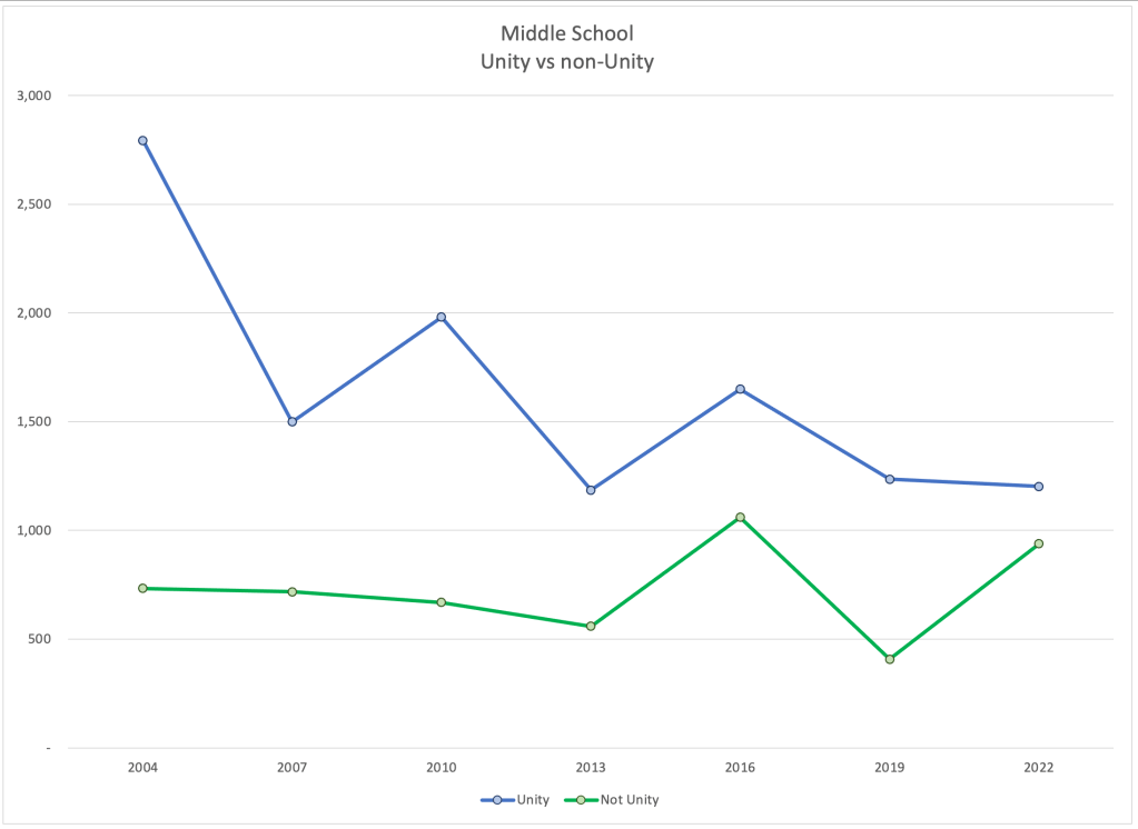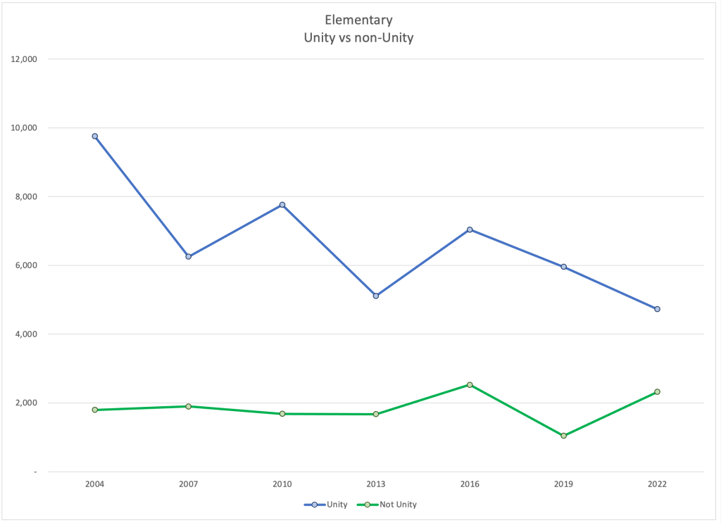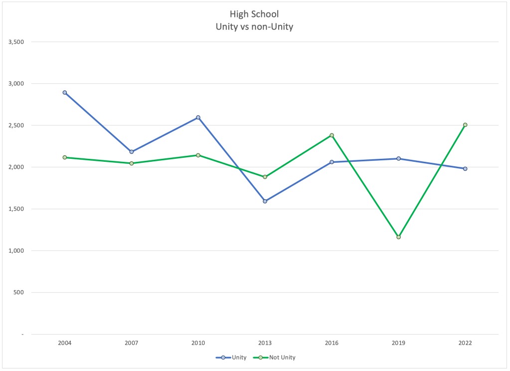 Unity continued to lose voters across every in-service division. They may be leveling out in high schools. We would need more evidence to support that. But it is possible that they have hit rock bottom in this division.