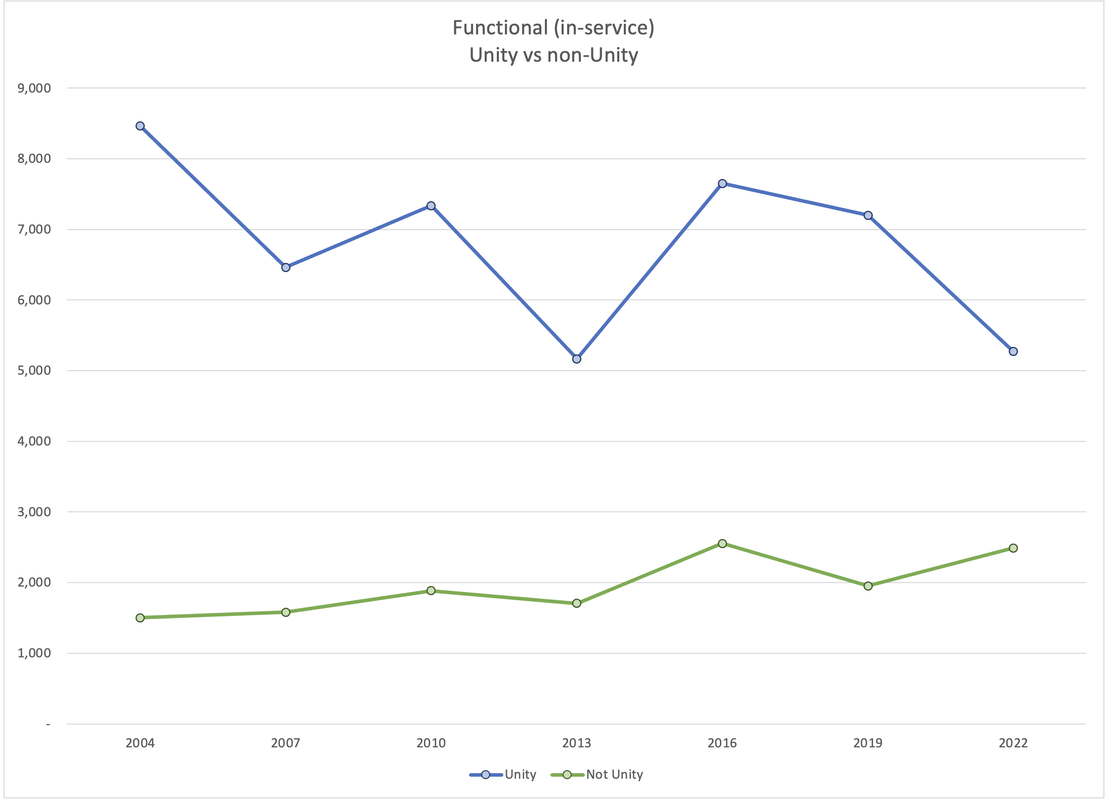 The blue and the green move in the same direction in five of the six year after year comparisons. However, in two of those Unity has a sharp fall while the non-Unity votes hold steady. There is no indication that the two sides are trading votes. They are fishing in separate ponds.