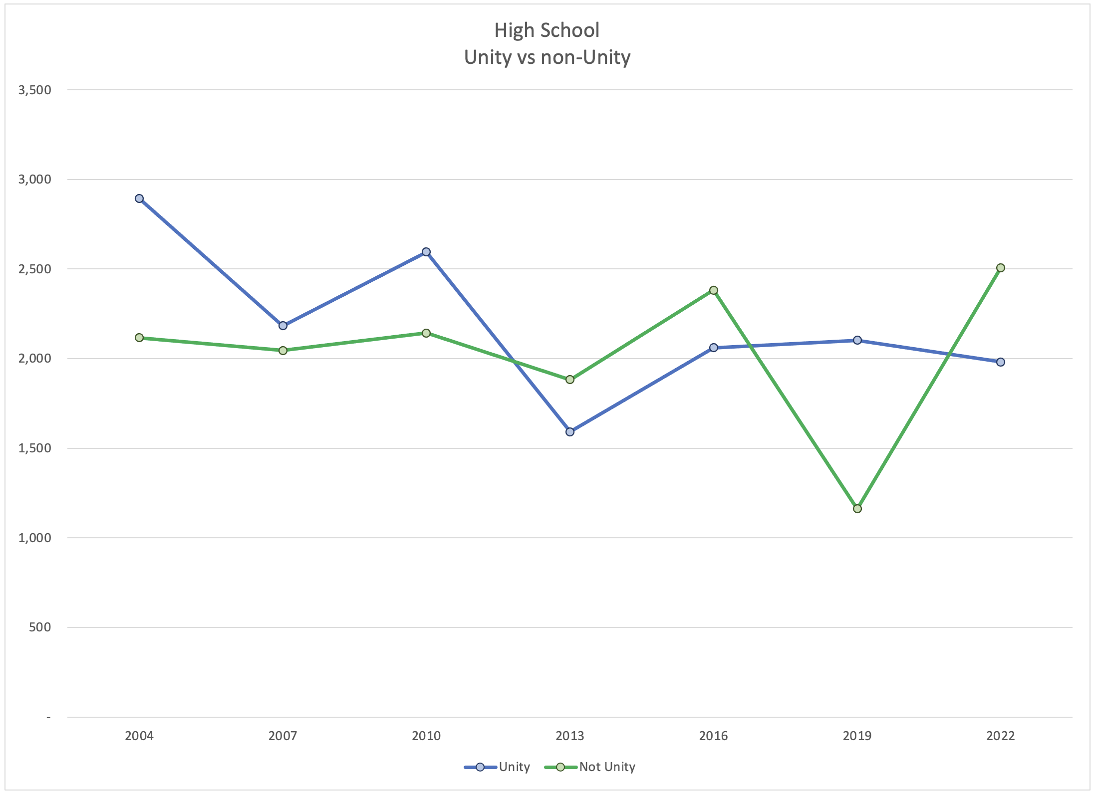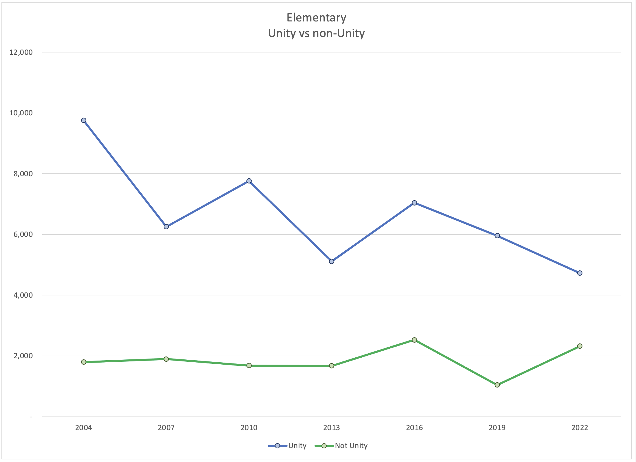 Unity continued to lose voters across every in-service division. They may be leveling out in high schools. We would need more evidence to support that. But it is possible that they have hit rock bottom in this division.