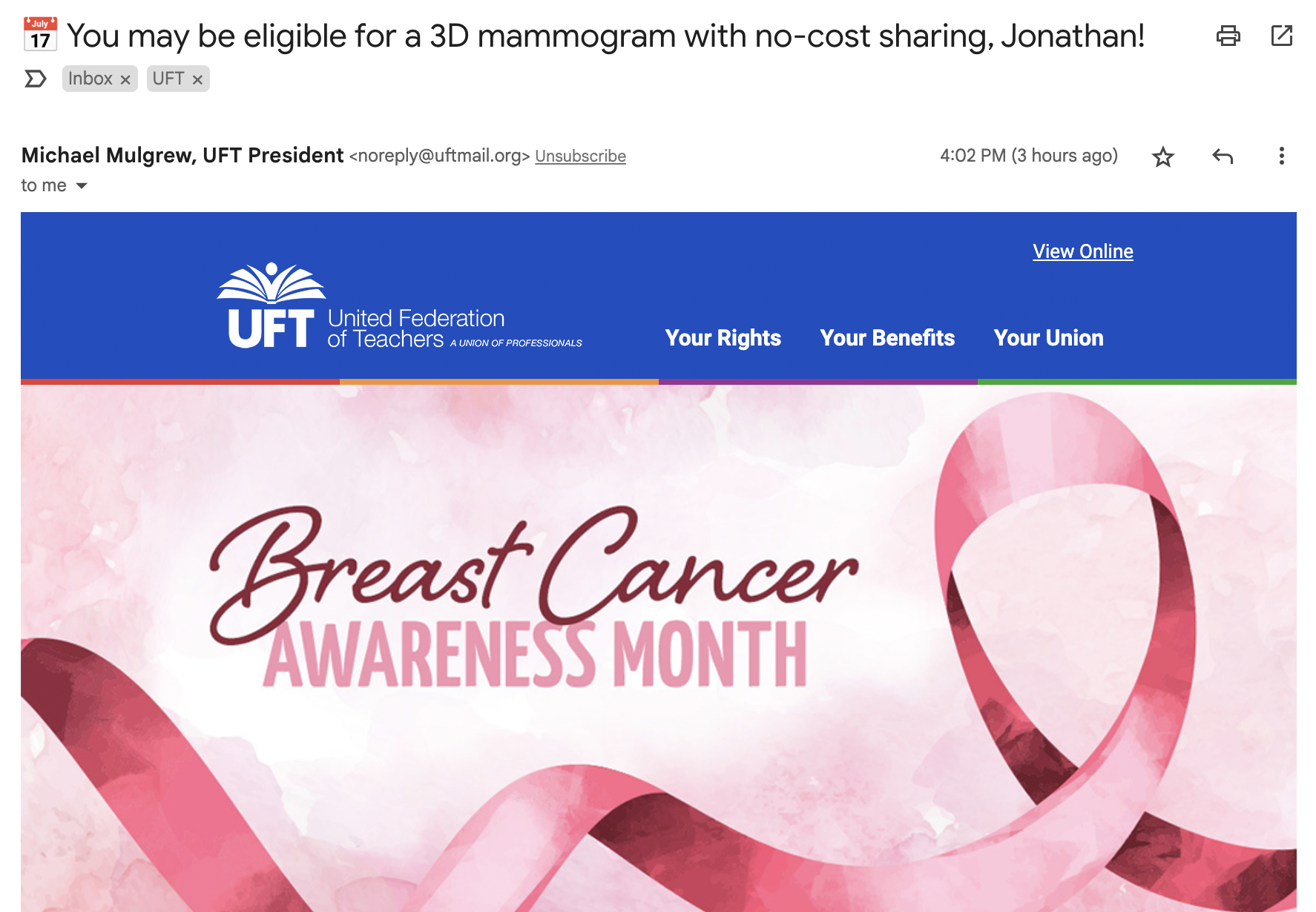 But anything else healthcare? Anything besides pushing retirees out of Medicare? Look at that email. If they have good news, they will trumpet it. Put Mulgrew’s name on it, try to shore up his lousy favorability ratings (it won’t work). If they have bad news, don’t say anything, hope members don’t notice.