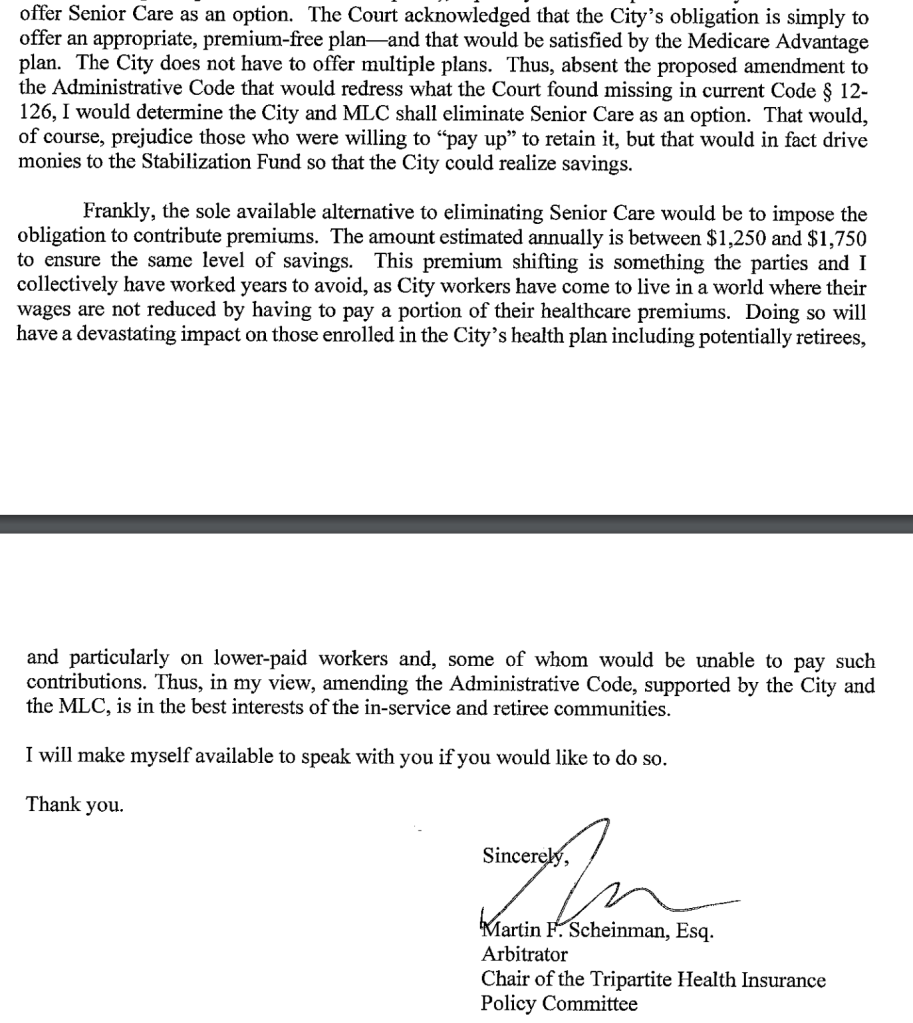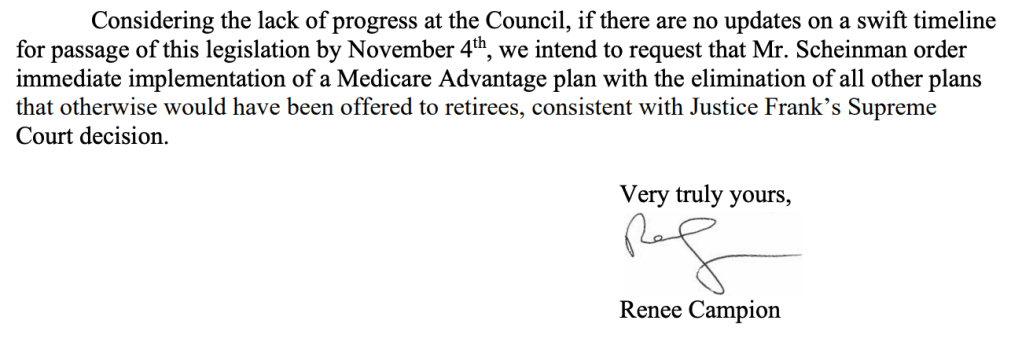 Renee Campion, Commissioner of the New York City Office of Labor Relations, wrote on October 28 that unless the City Council got moving on amending Section 12-126 of the City’s Administrative Code, that OLR would ask arbitrator Martin Scheinman to intervene and throw all of our retirees onto Medicare Advantage.