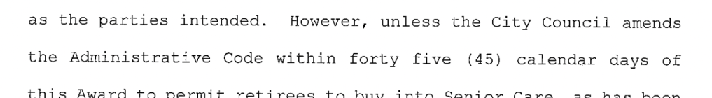 The “award” is strange. Ordering the City to conclude negotiations with Aetna in 25 days – well – Aetna is looking to maximize profit. And if Scheinman’s “award” holds, then the City is negotiating with a for-profit company that knows it is required to reach a deal. Dumb, right?