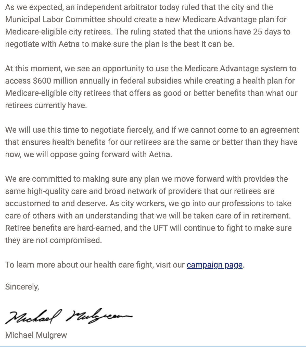 Now Mulgrew is jammed up. He needs to amend 12-126 so he can force retirees into Medicare Advantage – while leaving them a Senior Care option. But retirees don’t want that to happen. No one wants the upcharge on their current insurance. So Mulgrew has pulled out every threat – including threats he has no intention of following through on.