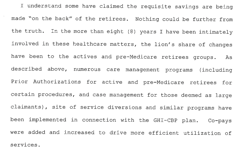 And in the whole of the document, Scheinman strangely claims knowledge of what the impacts of health care changes are on people who need health care. When he writes “I was persuaded that the Aetna program would meet the needs of the City retiree population” (p.24) he is appealing to an unqualified authority: himself.