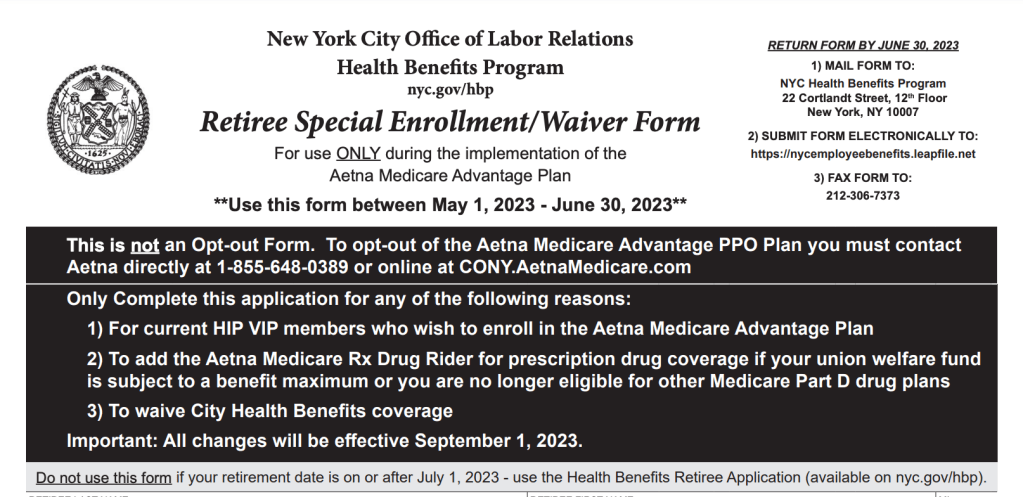 Retirees who do not wish to be enrolled in the Aetna Medicare Advantage PPO Plan or HIP VIP can waive City health coverage. Retirees must complete the Health Benefits Program Retiree Special Enrollment/Waiver Form to waive City health coverage. Completed forms should be returned to the Health Benefits Program….