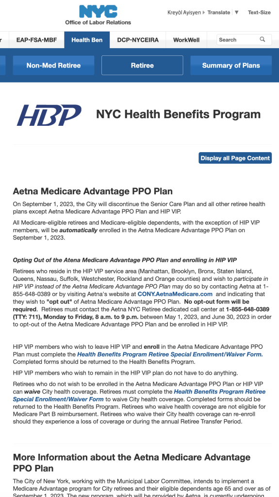 I’m not sure I agree that it is a two step process. I believe if you do what is said in the blog, send in the waiver and also call aetna it might screw up your waiver as calling aetna to opt out is to get you into hip, and thus you have done two conflicting things at the same time, waived city benefits and opted into hip vip…I believe you will then end up in HIP VIP rather than waiving city benefits and keeping traditional medicare.