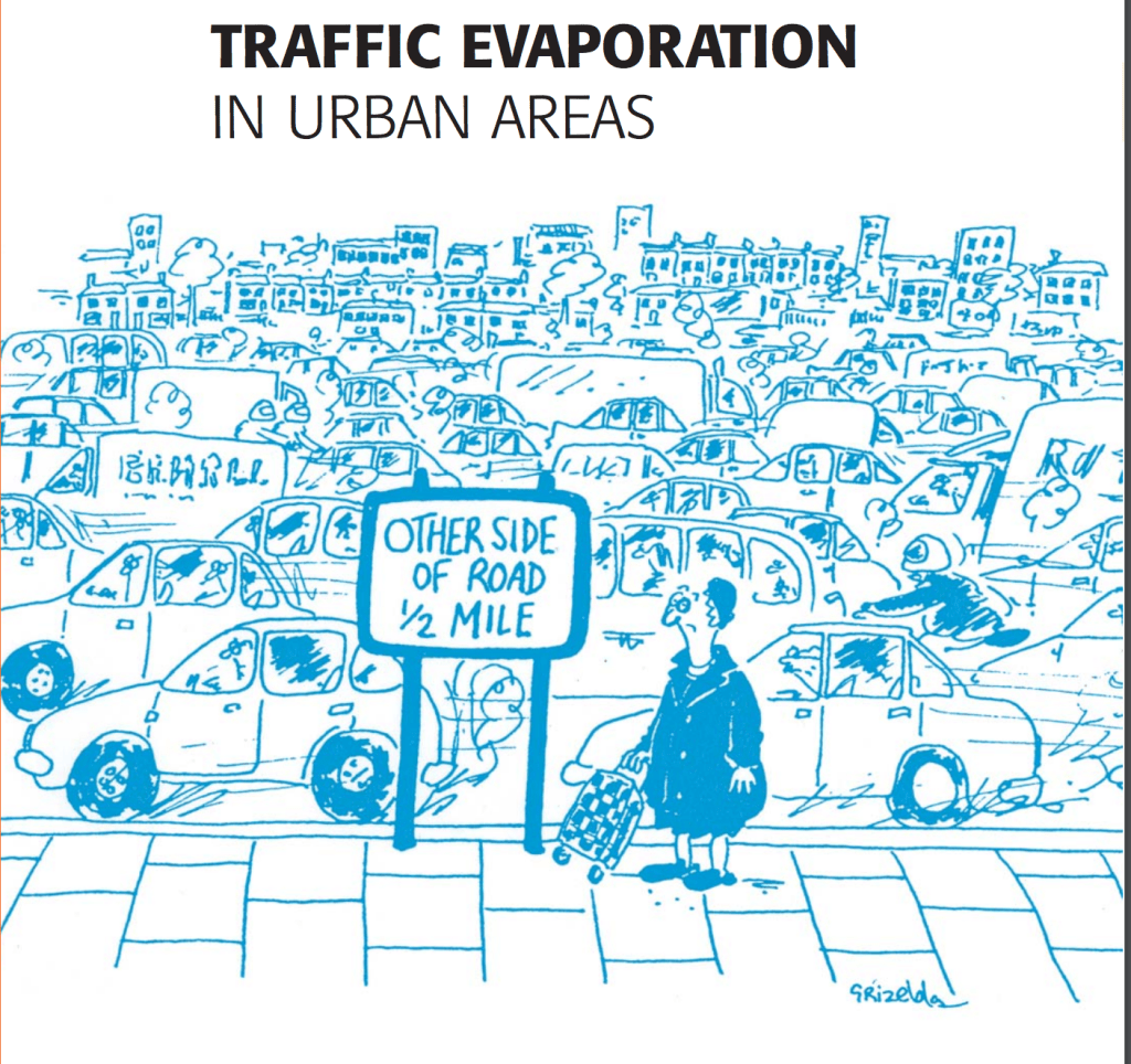 Corollary: Remove lanes, and traffic will drop until congestion reaches the previous level. Great study from the EU – click here to look it over (other links here are brief – but this one is 50 pages)