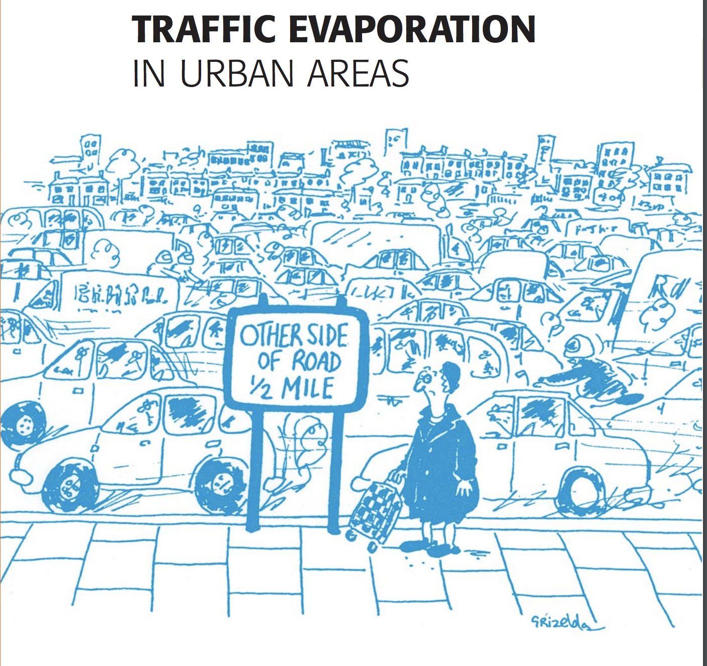 Corollary: Remove lanes, and traffic will drop until congestion reaches the previous level. Great study from the EU – click here to look it over (other links here are brief – but this one is 50 pages)