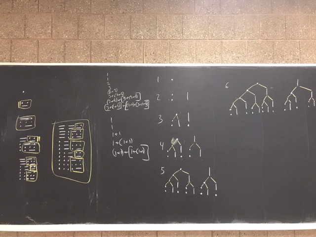 Friday the class had a game day (3-D tic tac toe with visualization challenges and embedded combinatorial questions, and sequence issues, it’s still a math class, even if they love it). And I walked over to the board, and sketched some solutions from previous years, solutions that emphasized an interesting and important (says me) aspect of Ghost. And I interrupted their game play (they were all spread out) and made them come over and take a look, and a few saw something they found interesting, but no one found anything as interesting as 3-D tic tac toe, which they quickly returned to….