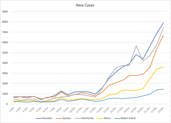 The second graph is cases per 10,000 population – so new case rates instead of raw numbers. Notice how Staten Island is double the other boroughs while Delta was dominant. (Trumpies not vaccinating). But also notice how, when omicron arrives, Manhattan takes off. Why? Are more people there sick? How does that happen? Or are more people there being tested? How does THAT happen?