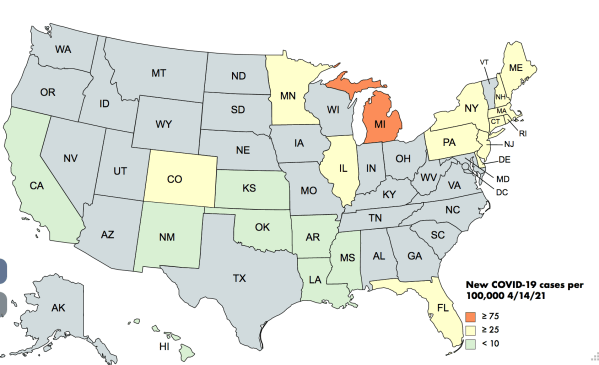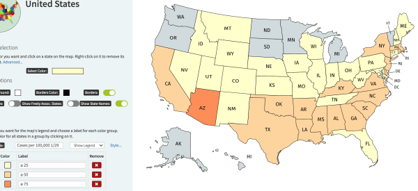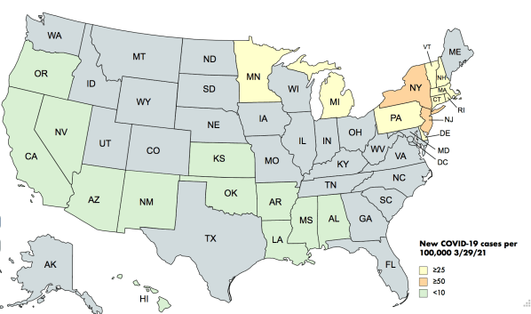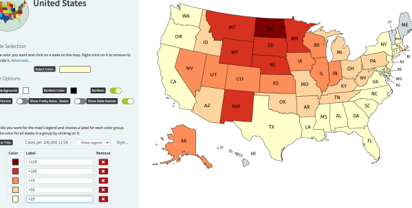 Colors: The reds are very bad, tans and yellows less bad. At some point I introduced light greens for rates that were above containment levels, but not necessarily indicative of community spread. That’s where most of the country is today.