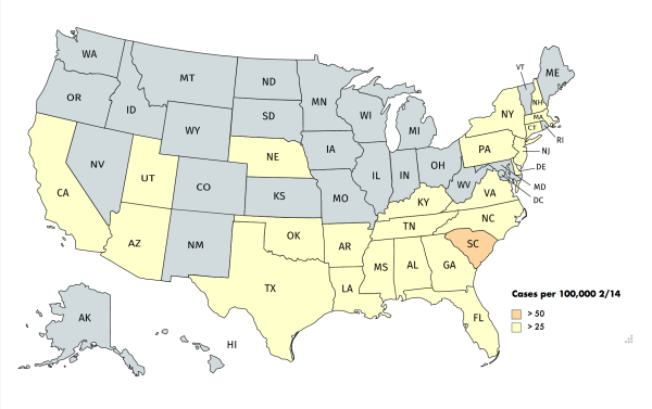 Numbers are from CDC, as presented here, on the heat map, by NPR. Maps, including mistakes, are mine.