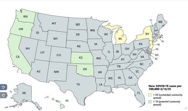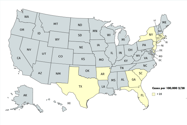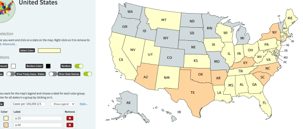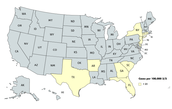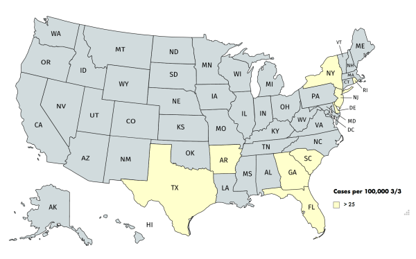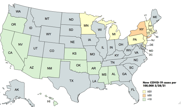 And while my map is not dramatic, only a few states are in the 25-50 new cases per 100,000 range, and the others are much lower than Jersey and New York: