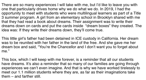· For school support and all other staff, our hard-working custodial workers, food service employees, school aides, parent coordinators — thank you. From my 20 years in the DOE, I know you all are the ones who keep it all together. This has been a year unlike any other.