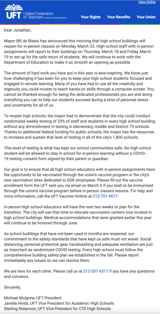 The UFT’s email to high school members 2 weeks ago, signed by Mulgrew, Janella Hinds, and Sterling Roberson, discusses testing and vaccination, and safety protocols, but nothing about instruction, or work rules related to in-person instruction. That is not an oversight. You can open this and zoom to read it: